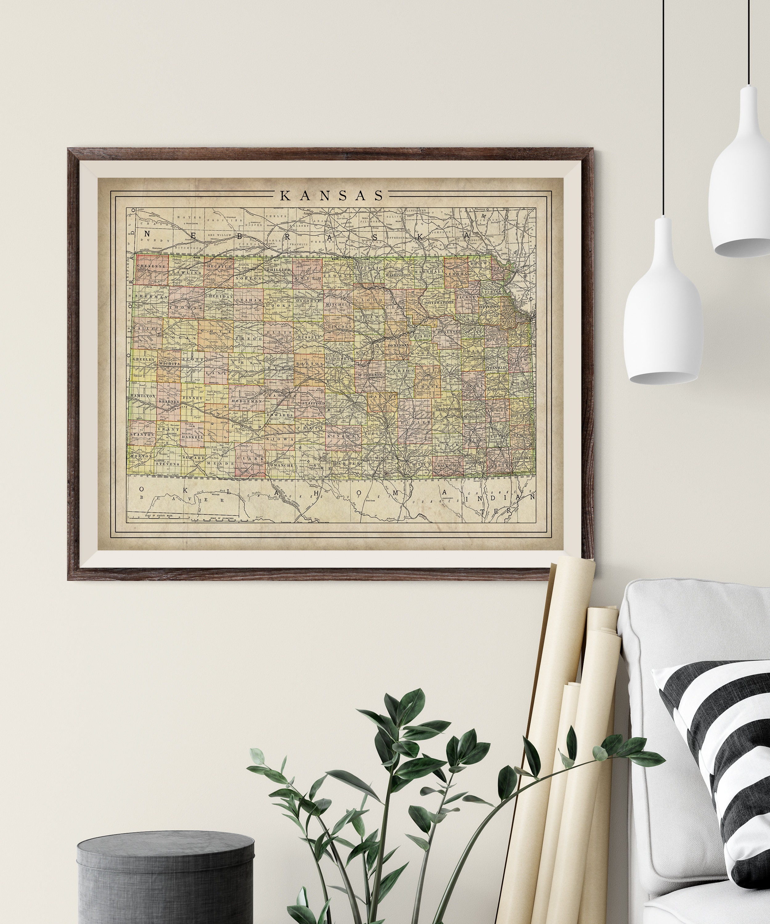 • Our print of an antique Kansas map has the realistic look of an aging map.
